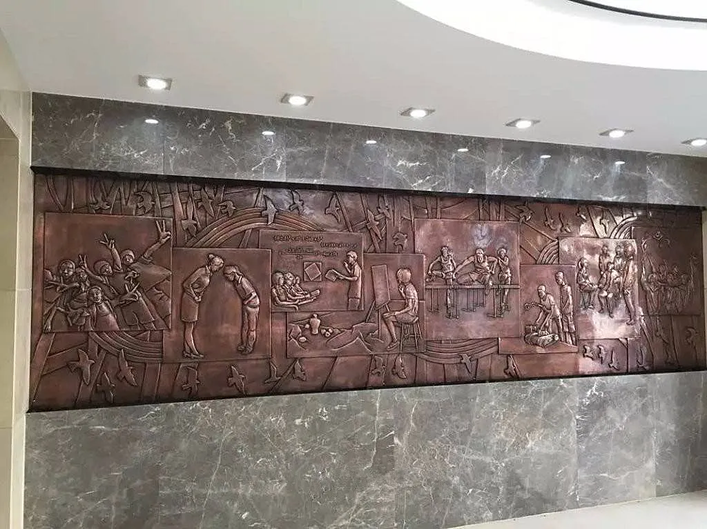 此外,玻璃钢的轻质特性也彻底改变了大型浮雕的安装方式。传统的石材或铜质浮雕,由于其巨大的重量,往往需要复杂的钢结构支撑和重型吊装设备,对建筑墙体本身也提出了极高的承重要求。而玻璃钢浮雕重量仅为石材的四分之一到五分之一,可以通过预埋件或专用胶粘剂直接固定在墙面上,大大降低了安装难度和成本,也拓宽了其应用场景。它不仅可以用于室内,也可以用于室外,即使在潮湿、酸雨或沿海地区,通过添加抗紫外线和耐腐蚀助剂,也能长期保持色彩与结构的稳定。